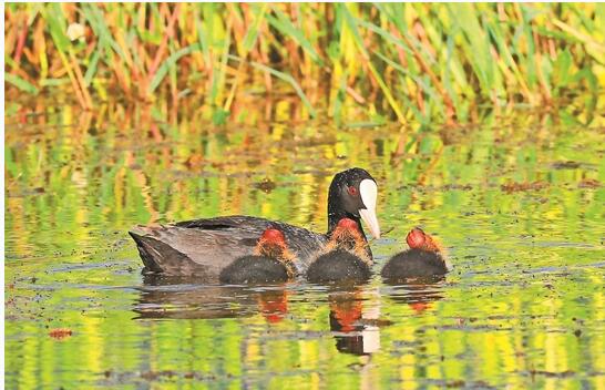 近日,云南保山青华海国家湿地公园管理中心的工作人员首次监测到2只成年骨顶鸡和5只幼鸟,它们在莕菜群落间觅食嬉戏。这是继绿头鸭之后第二种在青华海繁殖的冬候鸟。