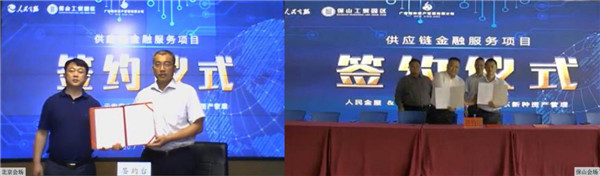 7月21日,北京人民日报社新媒体大楼和云南省保山市工贸园以远程视频连线形式举办了一场关于供应链金融服务项目的三方签约仪式。人民金服总经理张树申、副总经理王向来,云南省保山工贸园区管委会主任杨雁斌、副主任郭绍坤,广东新种资产管理有限公司董事长禾益康作为三方代表出席了本次签约仪式。中国建筑第五工程局有限公司、中国建筑第六工程局有限公司、中国铁建大桥工程局集团有限公司、中交一航局第一工程有限公司、中建海峡建设发展有限公司、中国市政工程北设计研究院第九设计研究院等央企代表共同出席了本次签约仪式。