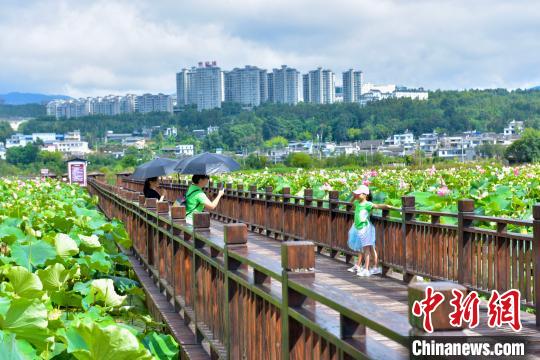 图为游客在十里荷花风景拍照留念。 侯开旷 摄