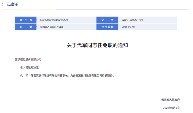9月7日,云南省人民政府网站发布《关于代军同志任免职的通知》显示,云南省人民政府决定代军任富滇银行董事长,免去富滇银行行长职务。