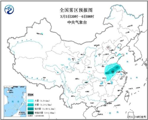 3月5日电 据中央气象台网站消息,中央气象台3月5日18时发布大雾黄色预警:预计,3月5日夜间至6日早晨,山东东南部和半岛地区、河南东部、安徽中北部、江苏中北部、湖北东部等地有大雾,其中河南东南部、安徽中北部、江苏中北部等地的部分地区有浓雾,局地有能见度不足200米的强浓雾;此外,粤东和闽西近海局地有大雾。