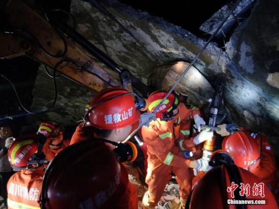 截至6月18日凌晨2时,四川省消防救援总队已调派宜宾、成都、自贡、泸州等地10个支队及总队全勤指挥部、总队战勤保障大队共116车、526人、4犬赶赴震中开展救援。图为宜宾长宁县双河镇葡萄村八组救援现场。文/中新社记者 刘忠俊 四川消防供图