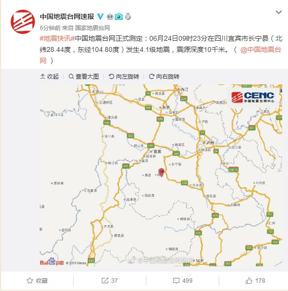 四川宜宾市长宁县发生4.1级地震 震源深度10千米
