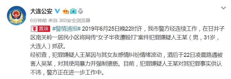 中新网6月25日电 据大连市公安局官方微博消息,25日晚22时许,大连市警方经连续工作,在甘井子区南关岭一居民小区将网传“女子半夜遭殴打”案件犯罪嫌疑人王某(男,31岁,大连人)抓获。