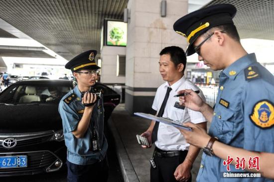 资料图:2018年5月16日,广州市交通委员会执法局执法人员在广州东站对网约车相关资质进行核查。中新社记者 陈骥旻 摄