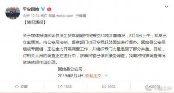 8月4日,固始县公安局通过官方微博@平安固始发布关于这一事件的《情况通报》。《通报》称,8月3日上午,固始县公安局已立案调查。河南省信阳市公安局法制、督察部门也已专程赶赴固始进行督办。固始县公安局组成专案组,正在全力开展调查工作,并组织专门力量追回了部分井盖。目前,对相关人员的调查正在进行中,涉事民警已停职接受调查,将根据调查情况依法依规作出处理。