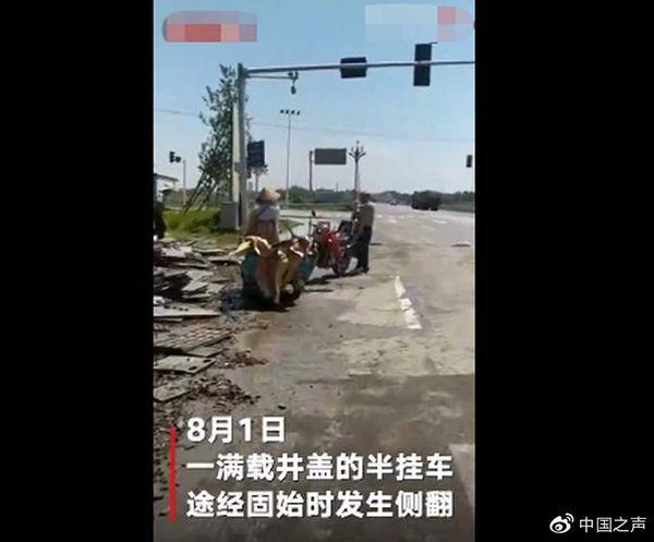 一辆满载下水道井盖的半挂车在8月1日夜里,途经河南固始县状元桥附近发生侧翻。8月2日,货主报警称,33吨货物被附近村民哄抢,货主无法制止。记者在一段网络视频中看到,不少井盖散落在路边,有些已经破碎,几个村民正在井盖中挑拣,并使用三轮车、平板车等工具,搬抬井盖,对周围的阻止置之不理。