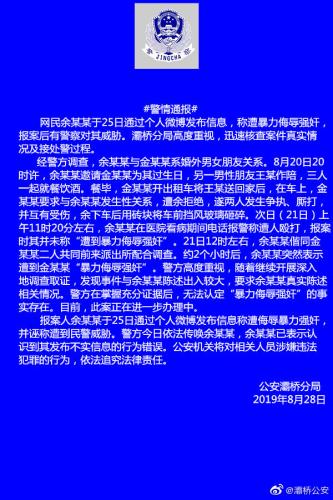 通报称,网民余某某于8月25日通过个人微博发布信息,称遭暴力侮辱强奸,报案后有警察对其威胁。霸桥分局调查后发现系不实信息,公安机关将对相关人员涉嫌违法犯罪的行为,依法追究法律责任。