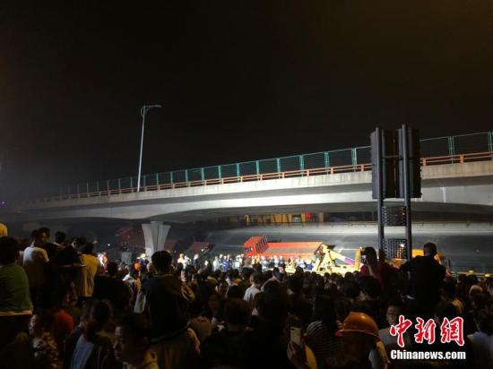 10月10日晚,江苏无锡,312国道上海方向锡港路上跨桥路段出现桥面垮塌,现场有多辆轿车被压,具体伤亡情况不详。救援车辆已抵达现场。周边道路已被封闭,当地交警正在进行分流疏导。目前救援工作正在进行中,具体伤亡情况也在统计当中。孙权 摄