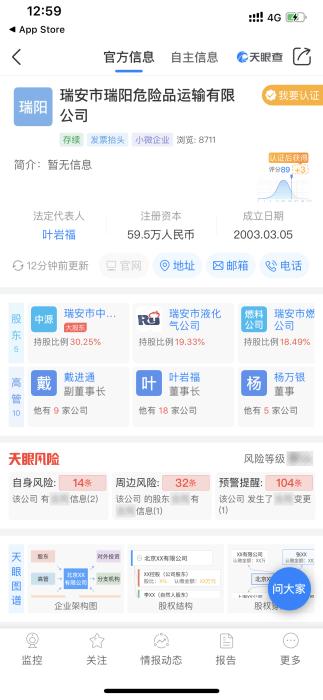据记者了解,G15沈海高速槽罐车爆炸事故中涉事的槽罐车属于瑞安市瑞阳危险品运输有限公司,该公司成立于2003年3月5日。据“天眼查”显示,该公司经营范围为危险品货运、汽车信息咨询服务、汽车租赁服务等,注册资本59.5万元。