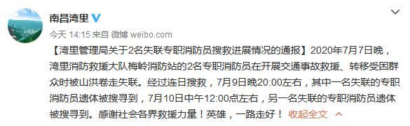 中新网7月10日电 据江西省南昌市湾里区官方微博消息,7月7日晚,湾里消防救援大队梅岭消防站的2名专职消防员在开展交通事故救援、转移受困群众时被山洪卷走失联。经过连日搜救,7月9日晚20:00左右,其中一名失联的专职消防员遗体被搜寻到,7月10日中午12:00点左右,另一名失联的专职消防员遗体被搜寻到。
