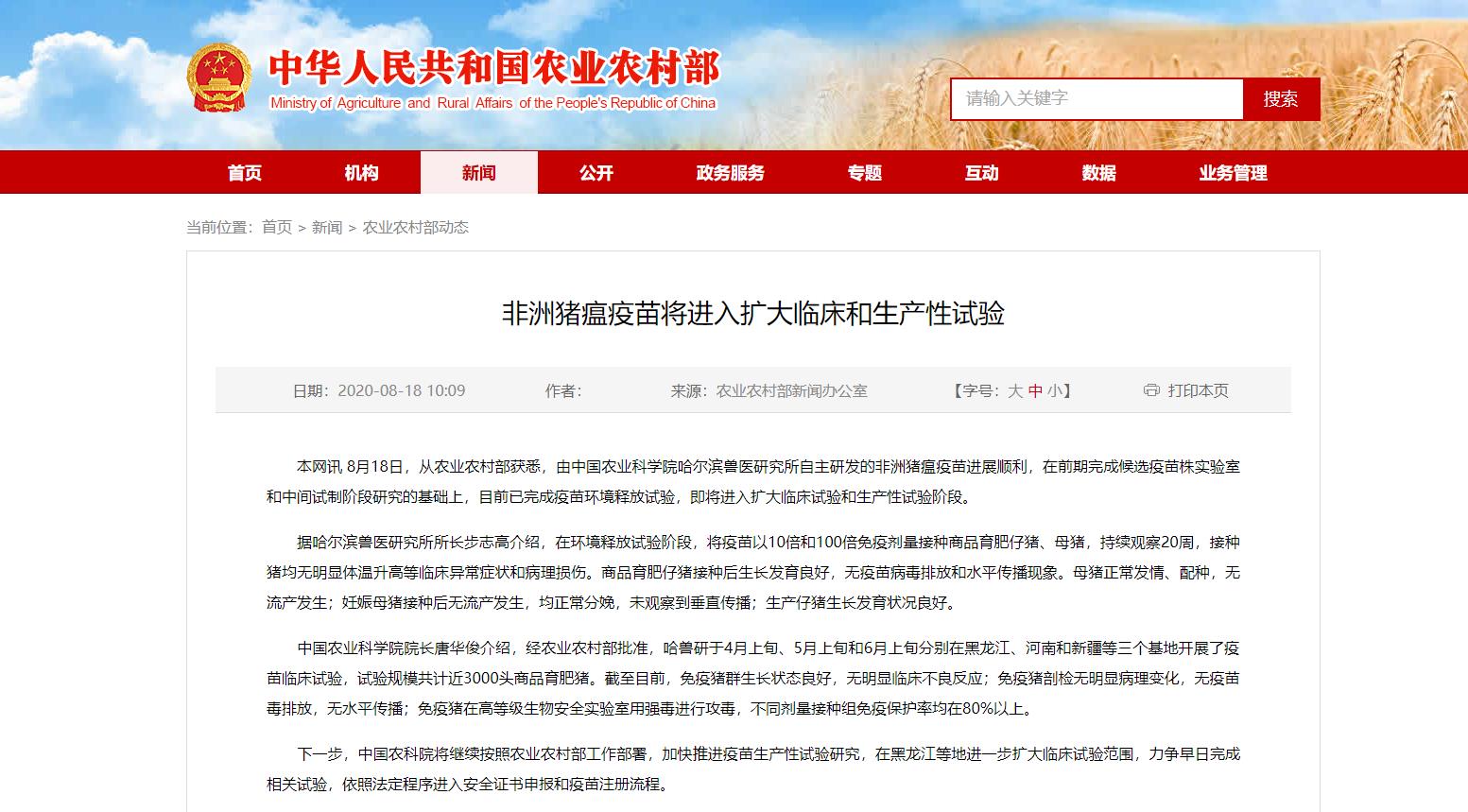 央视网消息: 据农业农村部网站消息,8月18日,从农业农村部获悉,由中国农业科学院哈尔滨兽医研究所自主研发的非洲猪瘟疫苗进展顺利,在前期完成候选疫苗株实验室和中间试制阶段研究的基础上,目前已完成疫苗环境释放试验,即将进入扩大临床试验和生产性试验阶段。