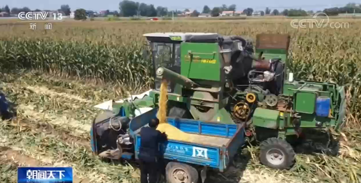 在黑龙江省哈尔滨市新胜村,由于台风过境造成部分玉米倒伏,为了应收尽收,当地一家合作社早早改装了10台收割机,经过改装后的收割机在玉米地里来回穿梭,不一会儿,货车就堆满了黄灿灿的玉米棒。
