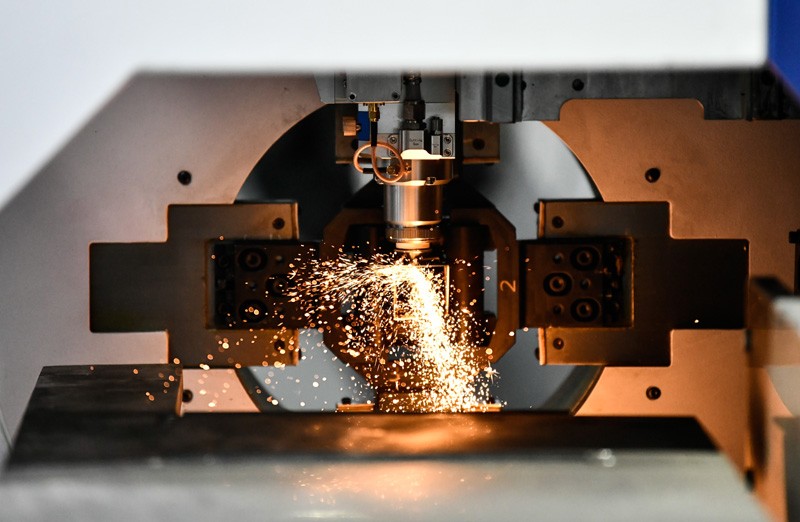 6月3日,在天津工博会上,激光切割机在进行金属切割作业。