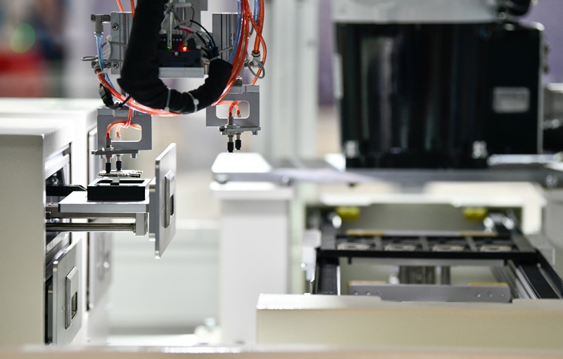 6月3日在天津工博会上拍摄的用于3C检测的轻型工业机器人。