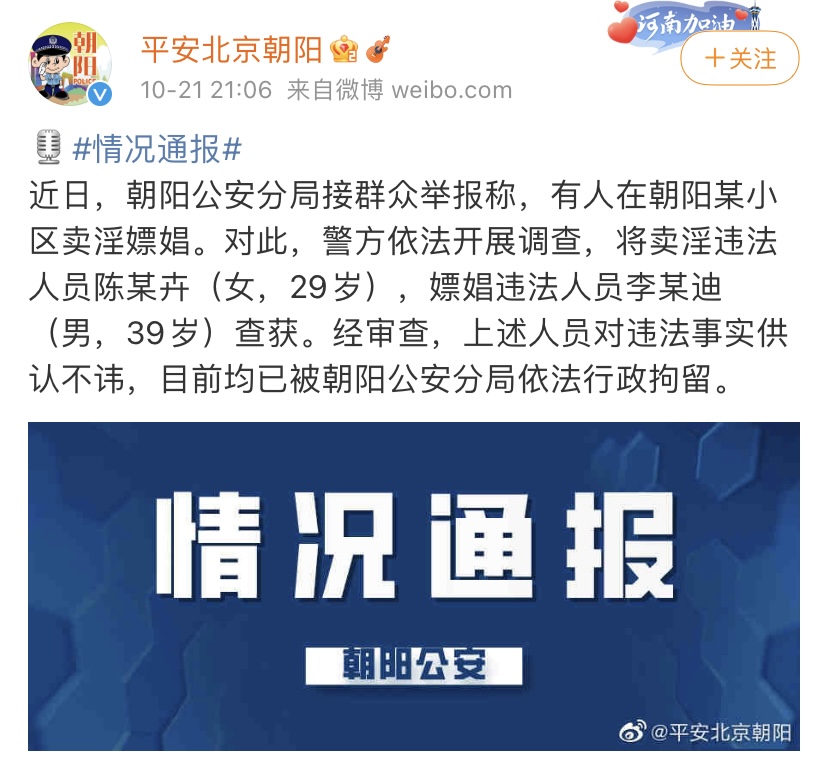 人民网北京10月21日电 (记者郝萍)记者今天从北京市公安局朝阳分局官方微博了解到,近日,朝阳公安分局接群众举报称,有人在朝阳某小区卖淫嫖娼。对此,警方依法开展调查,将卖淫违法人员陈某卉(女,29岁),嫖娼违法人员李某迪(男,39岁)查获。经审查,上述人员对违法事实供认不讳,目前均已被朝阳公安分局依法行政拘留。