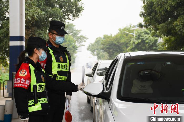 田国辉夫妻在执勤点对过往车辆和人员进行检查。 崇左边境管理支队供图