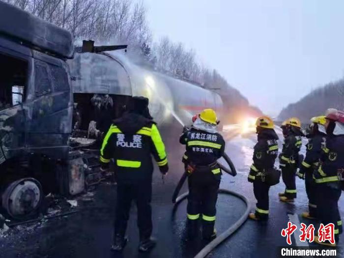 消防人员对油罐车灭火。 哈尔滨交警队提供
