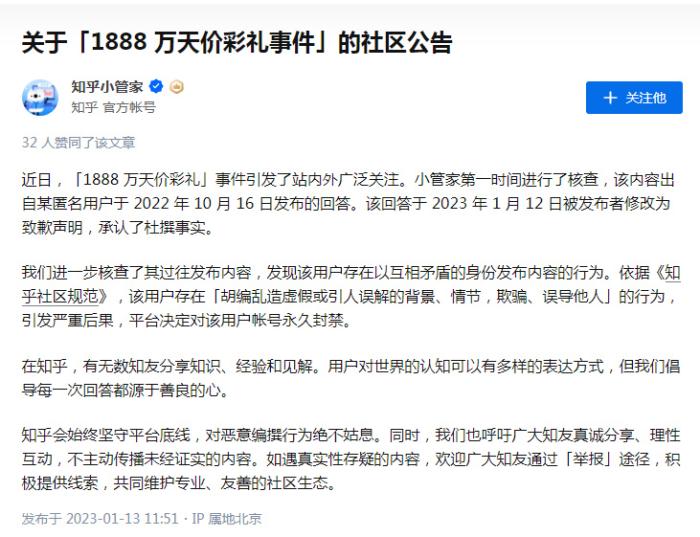 1月13日,知乎官方帐号“知乎小管家”发布公告称:知乎平台对发布“1888万天价彩礼”帖文的用户帐号进行永久封禁。