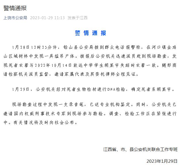 中新网1月29日电 据江西省上饶市公安局官方微信消息,江西省、市、县公安机关联合工作专班29日发布警情通报称,1月28日12时25分许,铅山县公安局接到群众电话报警称,在河口镇金鸡山区域树林中发现一具缢吊尸体。接报后公安机关迅速派员赶到现场勘查,发现死者衣着与2022年10月14日致远中学学生胡某宇失踪时衣着一致。随即商请检察机关派员监督,邀请家属代表及其委托律师全程见证。 1月29日,公安机关经对死者生物检材进行DNA检验,确定死者系胡某宇。