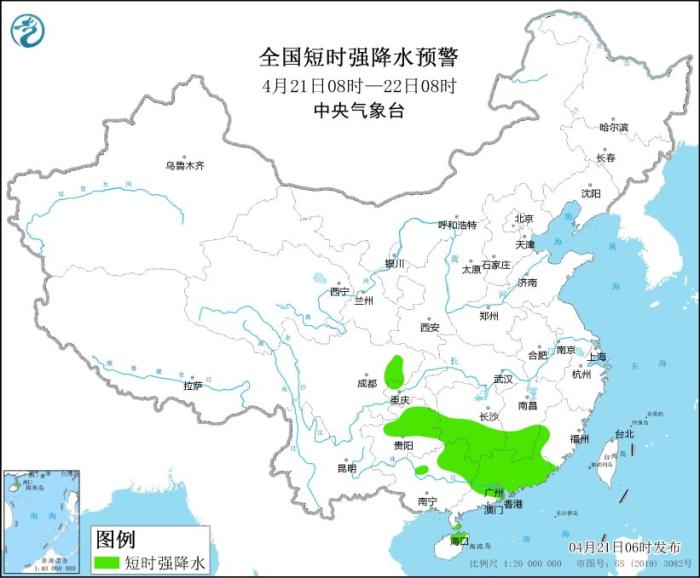 预计4月21日08时至22日08时,贵州中部、湖南南部、江西南部、广西东北部、广东中北部和东南部沿海等地的部分地区将有8-10级雷暴大风或冰雹天气;四川东部、重庆西部、贵州中北部、湖南中南部、江西南部、福建西南部、广西东北部、广东中东北部、海南岛东北部等地的部分地区将有短时强降水天气,小时雨量20-40毫米,局地可达60毫米以上。