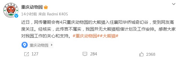 中新网4月25日电 据重庆市动物园管理处官方微博消息,近日,网传暑期会有4只重庆动物园的大熊猫入住襄阳华侨城奇幻谷,受到网友高度关注。经核实,此传言不属实,重庆动物园并无大熊猫租借计划及工作安排。