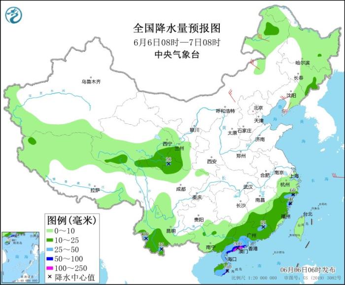 6月6日08时至7日08时,海南岛、广东西南部等地部分地区有大到暴雨,局地大暴雨(100~200毫米);云南南部、浙江南部、福建北部、川西高原北部、青海南部、甘肃西南部、东北地区东部、内蒙古东北部等地部分地区有中到大雨,浙江南部、福建北部等地局地有暴雨(50~70毫米)。内蒙古中东部、东北地区南部等地部分地区有4~6级风(见图1)。