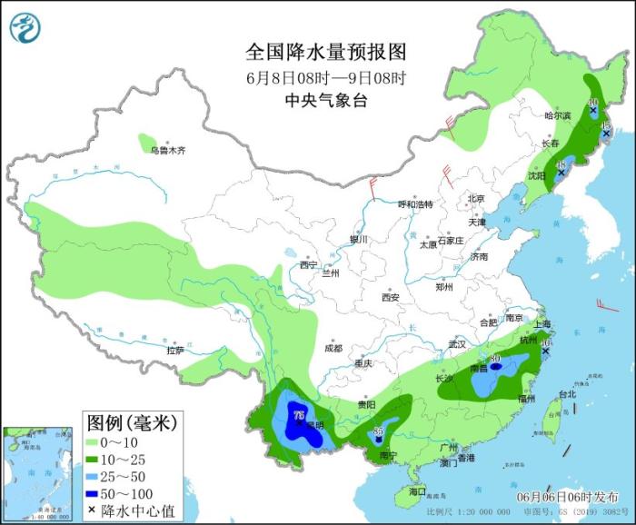 6月8日08时至9日08时,东北地区东部、江南中东部、云南中部、广西西部等地部分地区有中到大雨,云南中部等地部分地区有暴雨(50~85毫米)。内蒙古中部等地部分地区有4~6级风(见图3)。