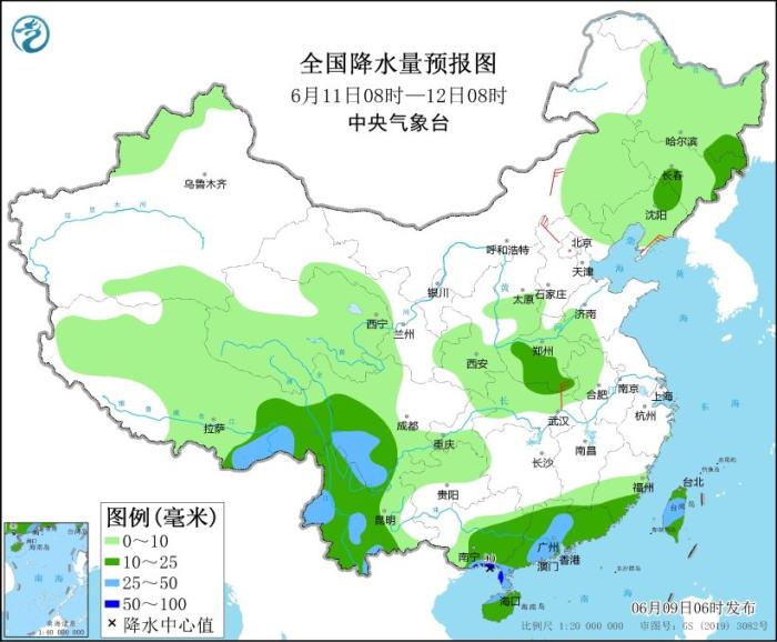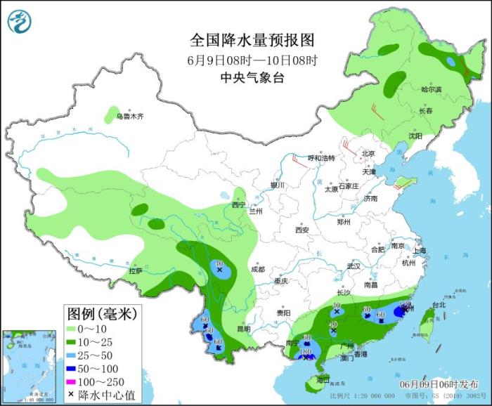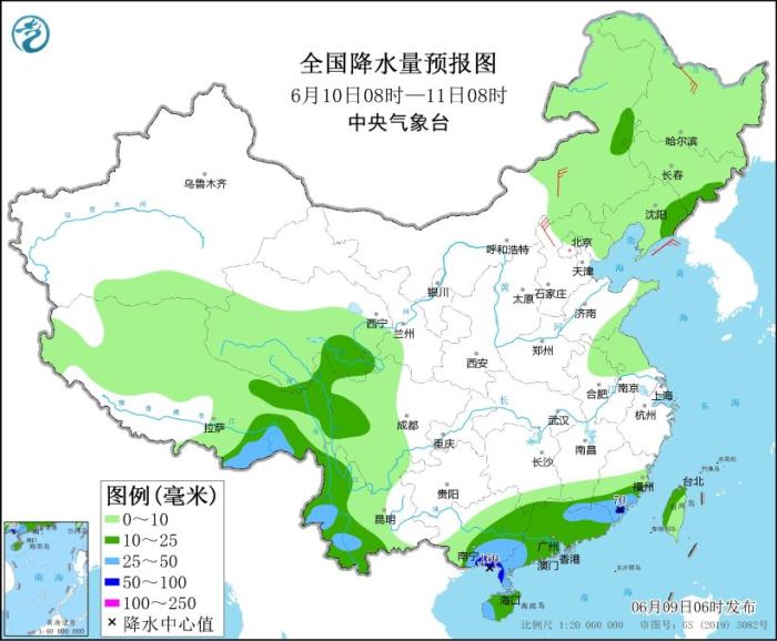 图2 全国降水量预报图(6月9日08时-10日08时)