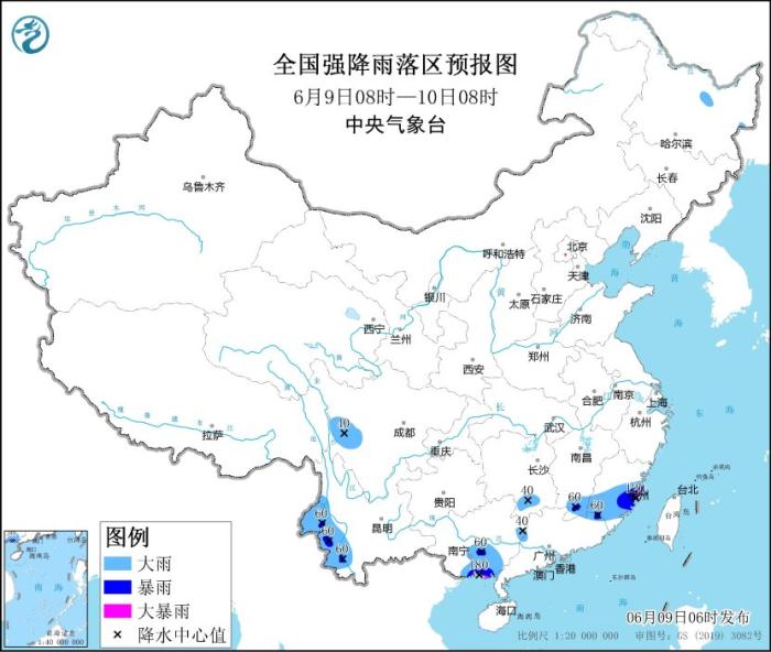 9日至11日,江南、华南、云南等地有中到大雨,局地有暴雨或大暴雨,小时雨量20~50毫米,局地可达60毫米以上;预计6月9日08时至10日08时,广西南部和东北部、湖南南部、江西南部、福建中南部、广东西北部、云南西部、四川西部等地部分地区有大到暴雨,其中,福建东部沿海、广西东南部沿海等地局地有大暴雨(100~180毫米)。上述部分地区伴有短时强降水,局地有雷暴大风或冰雹等强对流天气。中央气象台6月9日06时继续发布暴雨蓝色预警(见图1)。