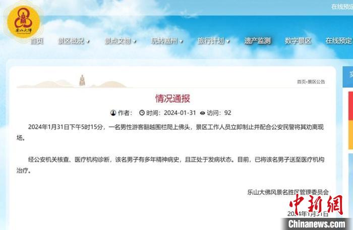 中新网成都2月1日电 (记者 刘忠俊)1月31日深夜,四川省乐山大佛风景名胜区管理委员会发布情况通报,称当日翻越围栏爬上佛头的男性游客有多年精神病史,事发时处于发病状态,已送医疗机构治疗。