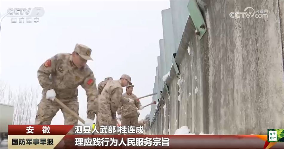 在安徽泗县,当地人武部组织民兵协助开展道路铲雪、除冰工作,确保返乡人员平安回家。