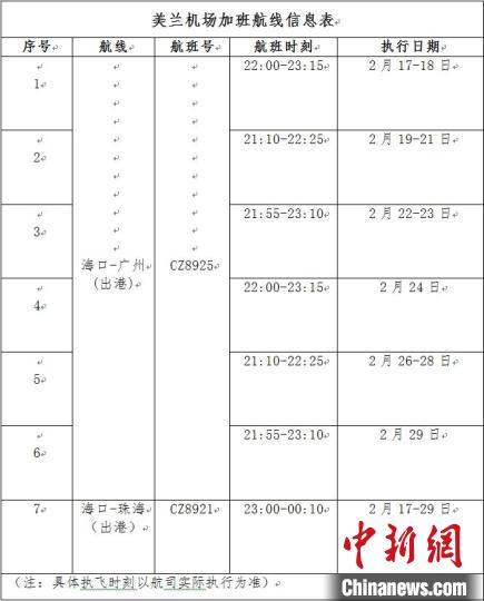 中新网海口2月17日电 (黄裕光 王春妍)海南控股旗下海南机场集团17日午间发布消息,为全力畅通旅客春节出岛返程,2月17日起,南方航空每天新增2架次单边出港航班,主要涉及海口至广州、珠海的出港航线,共计可提供座位约4200个。