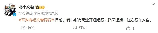 中新网2月21日电 据北京交警微博消息,目前,北京市所有高速开通运行,路面湿滑,注意行车安全。