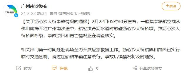中新网2月22日电 广州南沙发布微博发布关于沥心沙大桥事故情况的通报:2月22日05时30分左右,一艘集装箱船空载从佛山南海开往广州南沙途中,航经洪奇沥水道时触碰沥心沙大桥桥墩,致沥心沙大桥桥面断裂,事故原因和伤亡情况正在调查核实。