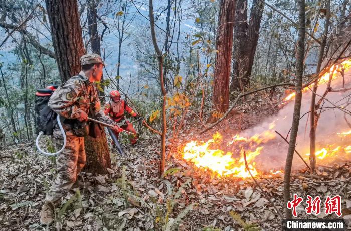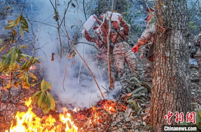 中新网百色2月23日电 (胡保卫 刘中海 梁力)2月21日14时30分许,广西百色市乐业县幼平乡达心村突发山林火灾。武警广西总队百色支队70余名官兵闻令而动,迅疾赶赴一线,按照“一情多案”的原则,灵活运用“控”“割”“灭”“扫”等方式,成功扑灭任务区域火情。