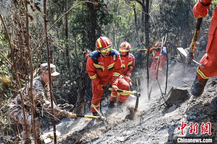 接到情况通报后,武警官兵第一时间抵达任务区域展开火灾现场警戒、扑灭零星山火和残留火种排查等任务。官兵划分成8个战斗小组,分片同步展开行动。同其余应急救援力量围绕多个大火点,开辟环形阻燃隔离带,建立起一道防火屏障,同时利用灭火把、风力灭火机等对明火进行扑灭。