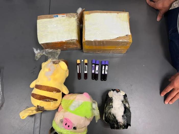 广州海关所属广州白云机场海关关员在对一架进境航班进行监管时,发现一名旅客携带的行李过机图像异常。海关关员随即进行拦截并开箱查验,现场查获藏匿于布偶玩具内部的血液样本,共计6管。
