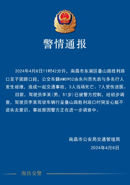 中新网4月8日电 据江西省南昌市公安局交通管理局官方微博消息,2024年4月8日11时42分许,南昌市东湖区叠山路胜利路口至子固路口段,公交车赣AM0902由东向西先后与多名行人发生碰撞,造成一起交通事故,3人当场死亡、7人受伤送医。