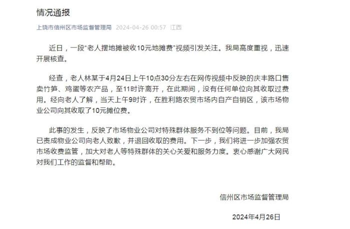 通报称,此事的发生,反映了市场物业公司对特殊群体服务不到位等问题。目前,信州区市场监督管理局已责成物业公司向老人致歉,并退回收取的费用。下一步,我们将进一步加强农贸市场收费监管,加大对老人等特殊群体的关心关爱和服务力度。衷心感谢广大网民对我们工作的监督和帮助。