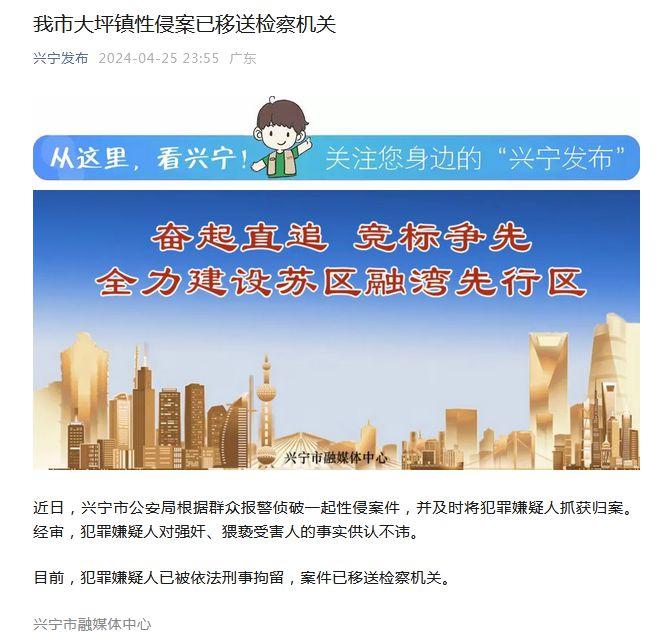 中新网4月26日电 据“兴宁发布”微信公众号消息,近日,兴宁市公安局根据群众报警侦破一起性侵案件,并及时将犯罪嫌疑人抓获归案。经审,犯罪嫌疑人对强奸、猥亵受害人的事实供认不讳。目前,犯罪嫌疑人已被依法刑事拘留,案件已移送检察机关。