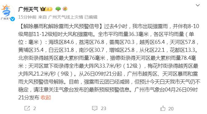 从26日09时21分起,广州市越秀区、天河区暴雨和雷雨大风预警信号解除。目前,强雷雨云团已经减弱,但预计今天白天广州市天气仍不稳定,请注意关注气象台发布的最新预报预警信息。