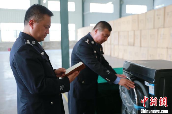 4月18日,民警正在巨野县一仓库内查验涉案洗衣机。梁犇 摄