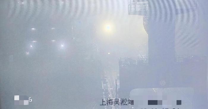 监控画面中,大雾笼罩下的码头能见度很低。(吴淞边检站供图)