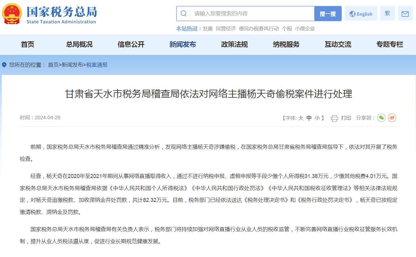 中新网4月29日电 甘肃天水查处偷税主播杨天奇前期,国家税务总局天水市税务局稽查局通过精准分析,发现网络主播杨天奇涉嫌偷税,在国家税务总局甘肃省税务局稽查局指导下,依法对其开展了税务检查。经查,杨天奇在2020年至2021年期间从事网络直播取得收入,通过不进行纳税申报、虚假申报等手段少缴个人所得税31.38万元,少缴其他税费4.01万元。国家税务总局天水市税务局稽查局对杨天奇追缴税款、加收滞纳金并处罚款,共计82.32万元。(中新财经)