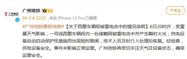 中新网5月7日电 据广州地铁官方微博消息,6日20时许,受雷暴天气影响,一号线西塱车辆段内一处接触网被雷电击中并产生瞬时火光,供电设备自动启动保护性措施而出现短时跳闸,技术人员及时介入处理后恢复。经检查,供电设备安全。事件未影响正常运营。广州地铁将密切关注天气及设备状态,确保运营安全。