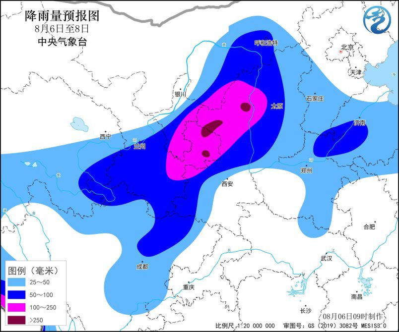 中新网8月6日电 据中央气象台网站消息,预计8月6日至8日,甘肃东部、宁夏中南部、陕西中北部、内蒙古中西部偏南、山西中西部等地有大到暴雨,局地大暴雨,累计降雨量50~80毫米,其中,甘肃东部、宁夏东南部、陕西中北部、山西西部等地部分地区100~200毫米,局地可达250毫米以上。上述地区最大小时降雨量20~50毫米,局地80毫米以上,并伴有雷暴大风等强对流天气。
