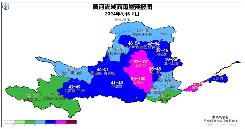 面雨量预报:预计6日至8日,黄河流域中游北洛河、无定河子流域面雨量86~107毫米,下游金堤河面雨量63~74毫米。