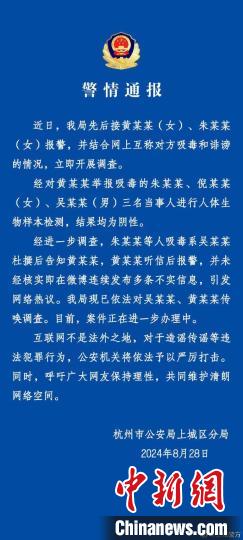 该警情通报称,近日,该局先后接黄某某(女)、朱某某(女)报警,并结合网上互称对方吸毒和诽谤的情况,立即开展调查。