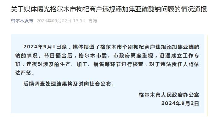 中新网9月2日电 据“格尔木发布”微信公众号消息,格尔木市人民政府办公室2日发布关于媒体曝光格尔木市枸杞商户违规添加焦亚硫酸钠问题的情况通报称,2024年9月1日晚,媒体报道了格尔木市个别枸杞商户违规添加焦亚硫酸钠的情况。节目播出后,格尔木市委、市政府高度重视,迅速成立工作专班,连夜对涉及的生产、加工、销售等环节进行核查,对于违法责任人将依法严惩。后续调查处理结果将及时向社会公布。